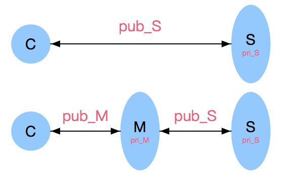 - 然后客户端C就使用服务器M提供的pub_M加密数据,节点M就获取到了数据的明文,就可以窃听,篡改数据了