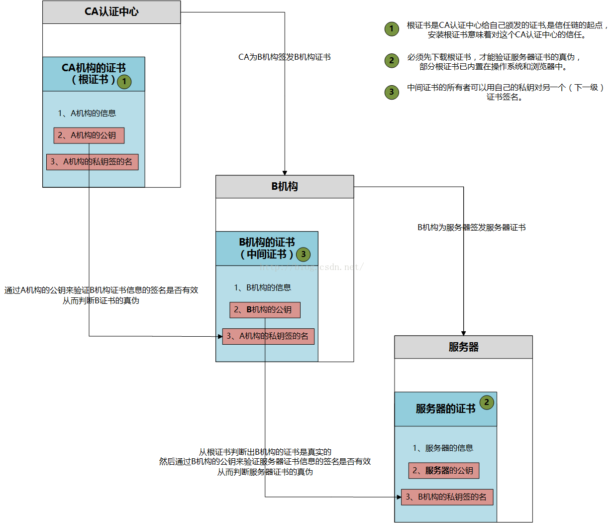 如果在根证书和服务器证书之间加一级或者多级证书,就构成了证书链,假设证书链的构架是:A->B->C->D…->M->N,A是根证书,N是服务器证书,中间B到M都是中间证书,都是由上一级CA机构颁发的,例如证书B就是由拥有证书A的机构颁发的,证书C由拥有证书B的机构颁发的,依次类推,如果想验证证书N的合法性,就要用到证书M,那如何保证证书M合法性呢,那就要继续往上验证,直到根证书。大致流程如下: